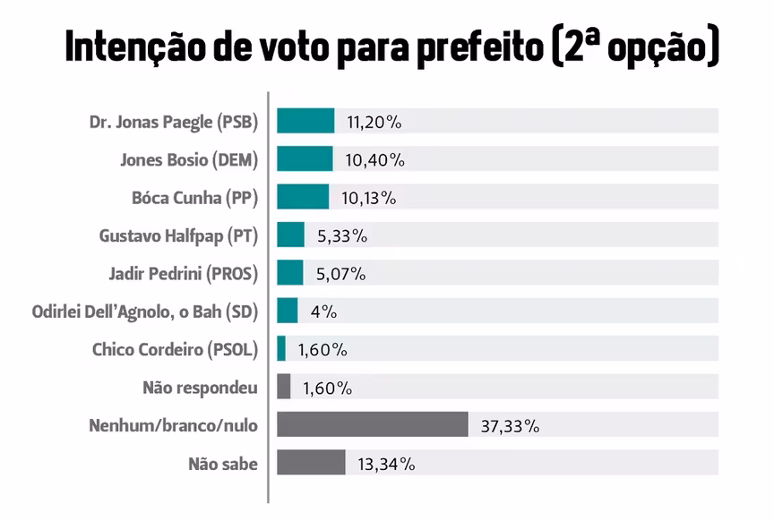 Nesse caso, Dr. Jonas é a segunda opção de 11,20% do eleitorado, mantendo-se em segundo lugar Jones Bosio, que é segunda opção de 10,40% dos eleitores. Perto dele está o prefeito Bóca Cunha, segunda opção de 10,13% do eleitorado brusquense.