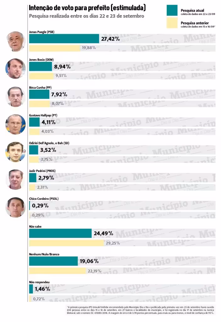 A segunda pesquisa de intenção de voto encomendada pelo Município Dia a Dia mostra um crescimento da candidatura de Dr. Jonas (PSB) na disputa à Prefeitura de Brusque. Ele passou de 19,88% para 27,42% desde a última pesquisa, divulgada uma semana atrás. Por outro lado, o levantamento mostra que ainda há um alto número de indecisos: 24,49% do eleitorado, o que mantém o resultado da eleição de domingo em aberto.
