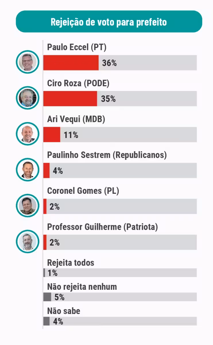 Ex-prefeitos têm a maior rejeição entre os candidatos A pesquisa encomendada por O Município também mediu o índice de rejeição dos candidatos à Prefeitura de Brusque perante a população. A rejeição é medida pela resposta dos eleitores à seguinte pergunta: "Em quais destes candidatos você não votaria de jeito nenhum para prefeito de Brusque?". Assim como na intenção de voto estimulada, há um empate técnico entre Paulo Eccel e Ciro Roza quanto à rejeição. 36% dos eleitores responderam que não votariam de jeito nenhum em Eccel, já 35% responderam que nunca votariam em Roza. Ari Vequi vem na sequência, com rejeição de 11%, segundo a pesquisa. Paulinho Sestrem tem rejeição de 4% e Coronel Gomes e Professor Guilherme são rejeitados por 2% dos eleitores entrevistados. Apenas 1% dos entrevistados rejeita todos os candidatos. 5% não tem rejeição a nenhum dos postulantes à prefeitura e 4% não soube responder.