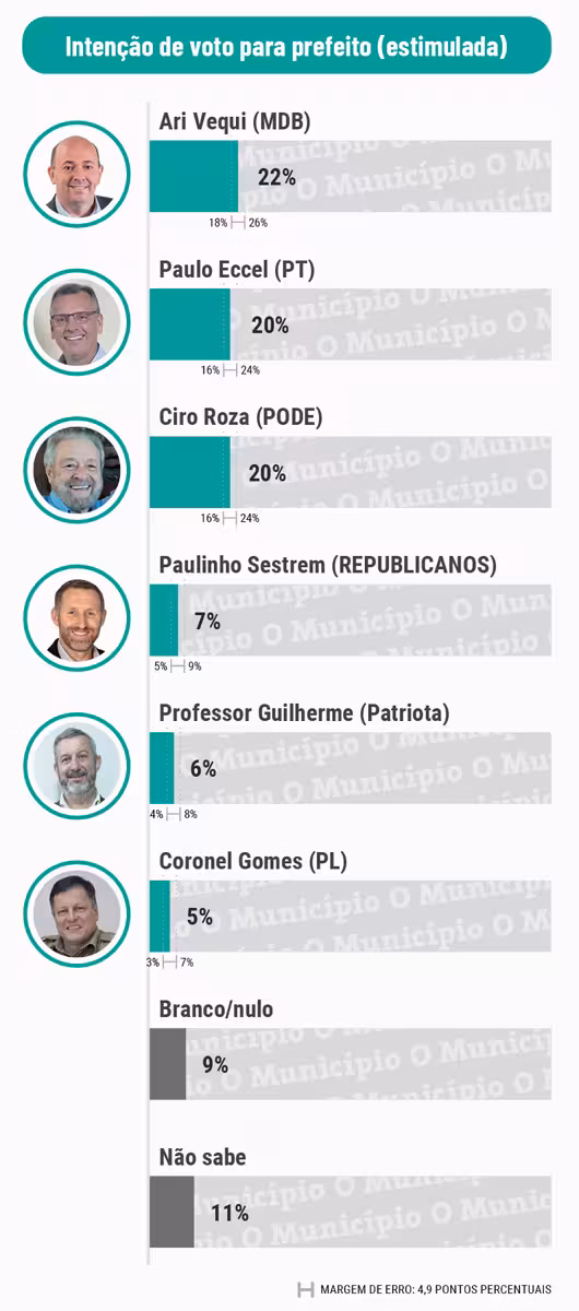 A pesquisa de intenção de voto encomendada por O Município mostra que três candidatos a prefeito de Brusque estão tecnicamente empatados para o pleito de 15 de novembro, considerando a margem de erro de 4,9%. De acordo com o levantamento, Ari Vequi (MDB) está com 22% das intenções de voto dos brusquenses. Paulo Eccel (PT) e Ciro Roza (Podemos) estão logo atrás, empatados com 20% cada um. Levando em consideração a margem de erro, Vequi pode ter de 18% a 26% das intenções de voto, segundo o levantamento. Empatados, Eccel e Roza podem ter de 16% a 24%. A pesquisa Instituto Mapa encomendada por O Município ouviu 406 eleitores entre os dias 14 e 15 de outubro, em 39 bairros e localidades de Brusque por telefone fixo e celular. O levantamento foi registrado no Tribunal Regional Eleitoral (TRE-SC) dia 10 de outubro, sob o número SC-06288/2020. A margem de erro é de 4,9 pontos percentuais, para mais ou para menos, e nível de confiança de 95%. Entre os entrevistados, 52% são mulheres e 48% são homens. A maior parte (46%) tem entre 25 a 44 anos. Os eleitores consultados, em sua maioria (77%), tem até o Ensino Médio completo e são economicamente ativos (91%). Os outros três candidatos também estão tecnicamente empatados, com menos de 10% das intenções de voto, de acordo com a pesquisa. Paulinho Sestrem (Republicanos) aparece com 7%, segundo o levantamento. Professor Guilherme (Patriota) aparece com 6% e Coronel Gomes (PL) tem 5% das intenções de voto. Eleitores indecisos Os dados da pesquisa estimulada de intenção de voto em Brusque mostram ainda que 9% dos eleitores devem votar em branco ou nulo e 11% ainda não sabem em quem votar no dia 15 de novembro.
