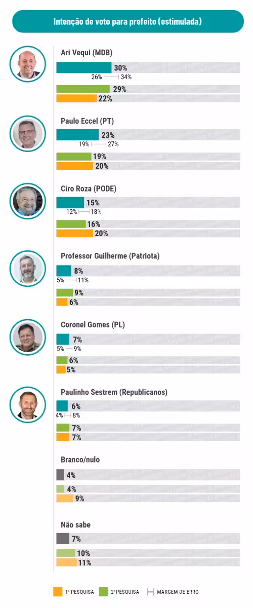 O levantamento, assim como os dois anteriores, indica uma leve vantagem de Vequi na disputa, com 30% das intenções de voto, ou seja, ele teve uma oscilação de 1% para cima em relação à última pesquisa, publicada no dia 31 de outubro.