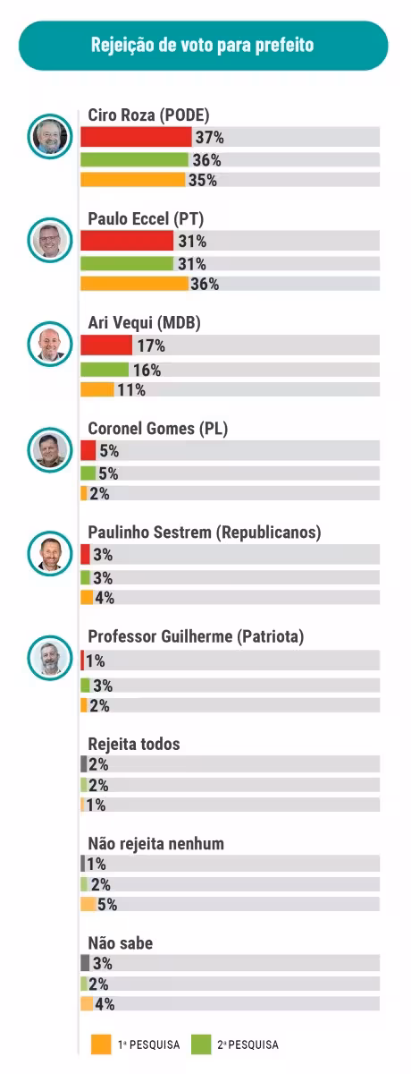 De acordo com o levantamento, Ciro Roza se mantém à frente com 37% de rejeição entre os eleitores, 1% a mais do que na pesquisa anterior.