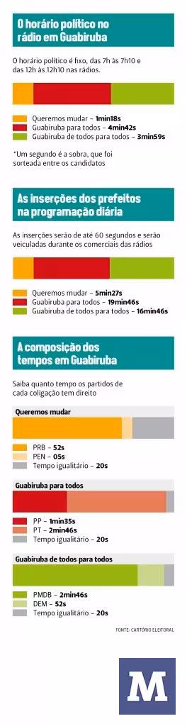 Em Guabiruba, a coligação do PT com o PP, que tem como candidatos Matias Kohler (PP) como prefeito e Valmir Zirke (PP), terá o maior tempo: 4min42s. Em seguida, vem a coligação PMDB e DEM, de Orides Kormann e Nilton Kohler, com 3min59s. Osmar Vicentini e Jorge Ponchirolli, ambos do PRB, que se coligou com o PEN, terá um 1min18s.