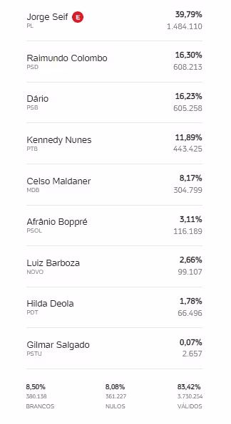 Confira o desempenho dos candidatos ao Senado por Santa Catarina em Brusque:
