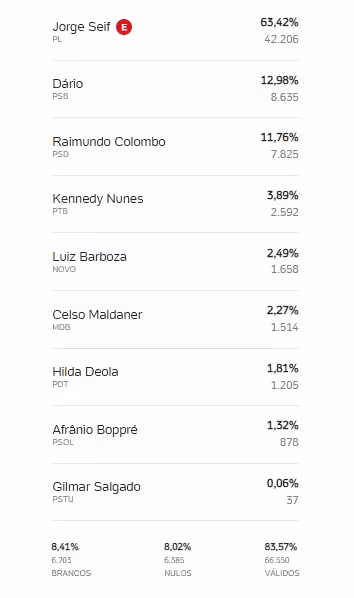 Em Brusque, Seif foi o candidato ao Senado mais votado, com 41.206 votos. Em seguida, foi Dário (PSB), com 8.635 votos. Em Guabiruba, o candidato que recebeu mais votos foi Seif, com 7.295 votos; seguido de Dário, com 1.223. Já em Botuverá, os mais votados foram Seif, com 1.242 votos, e Celso Maldaner (MDB), com 726.