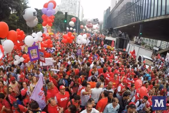 Maioria está vestida de vermelho, com bandeiras do PT e da CUT