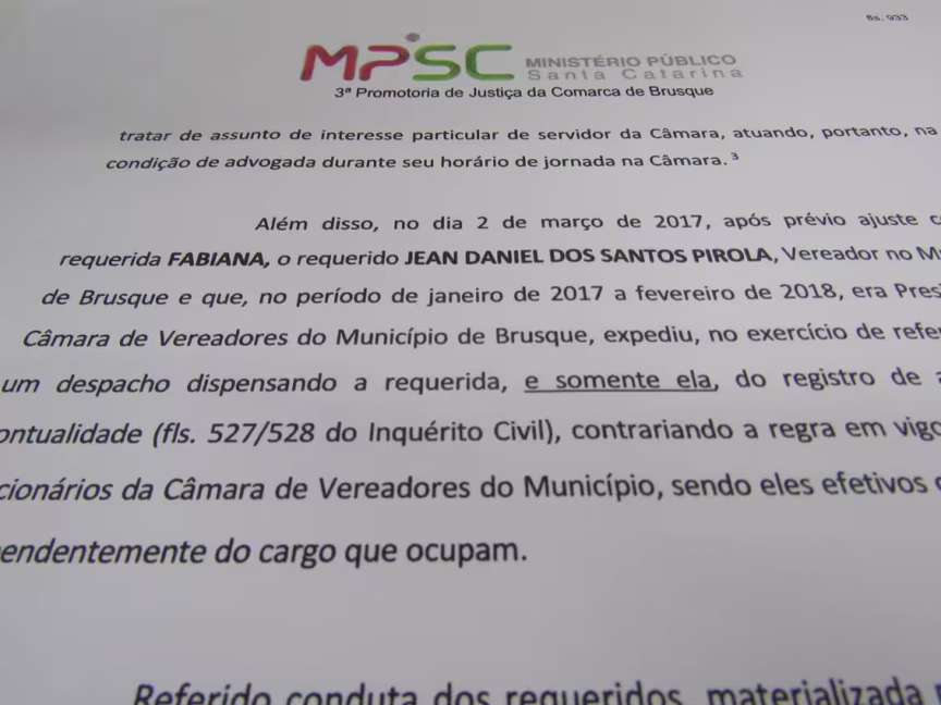 O ex-presidente da Câmara de Vereadores de Brusque Jean Pirola (PP) e a diretora do departamento jurídico e legislativo, Fabiana Amália Dalcastagné, são réus em ação civil pública por improbidade administrativa.