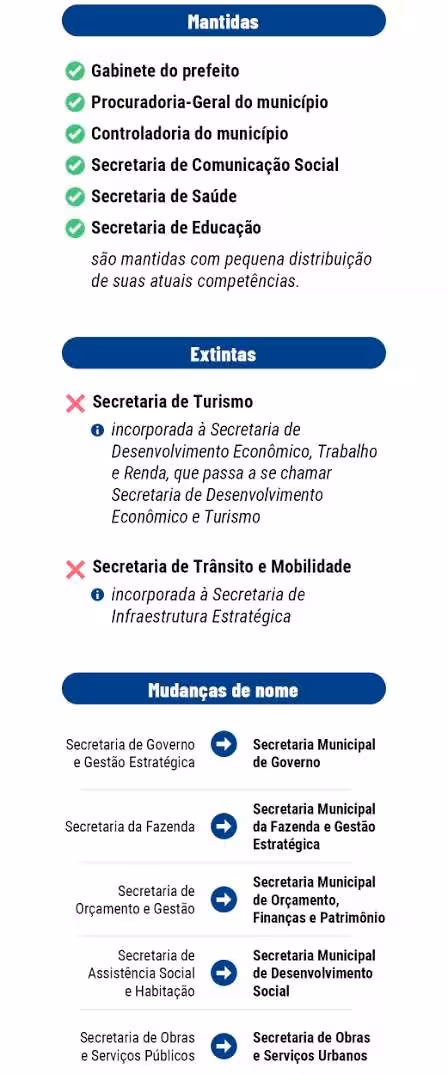 Segundo a proposta enviada à Câmara, o Gabinete do prefeito, a Procuradoria-Geral do município, Controladoria do município, Secretaria de Comunicação Social, Secretaria de Saúde e Secretaria de Educação são mantidas, com pequena distribuição de suas atuais competências.