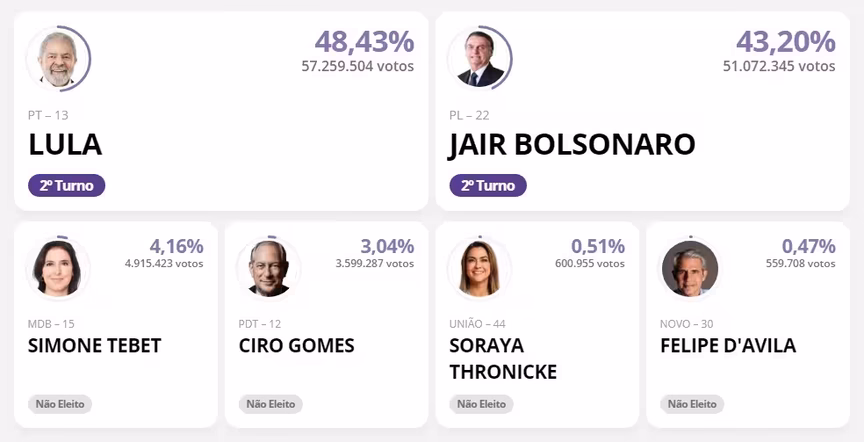 Primeiro colocado na contagem de votos, Lula fez exatos 57.259.504 votos, equivalente ao percentual de 48,43% de votos válidos.