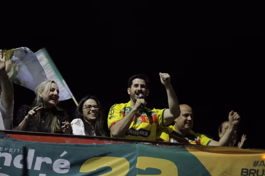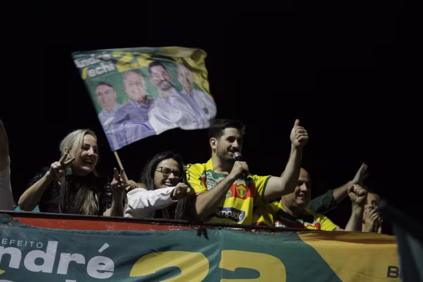 Após a reeleição, André Vechi (PL) foi até o Centro de Brusque festejar a vitória com apoiadores na noite deste domingo, 6. O chefe do Executivo exercerá a função até dezembro de 2028. O vice-prefeito André Batisti, o Deco (PL), foi reeleito junto com Vechi na chapa. Eles comemoram a vitória no bairro Limeira e então seguiram para o Centro.