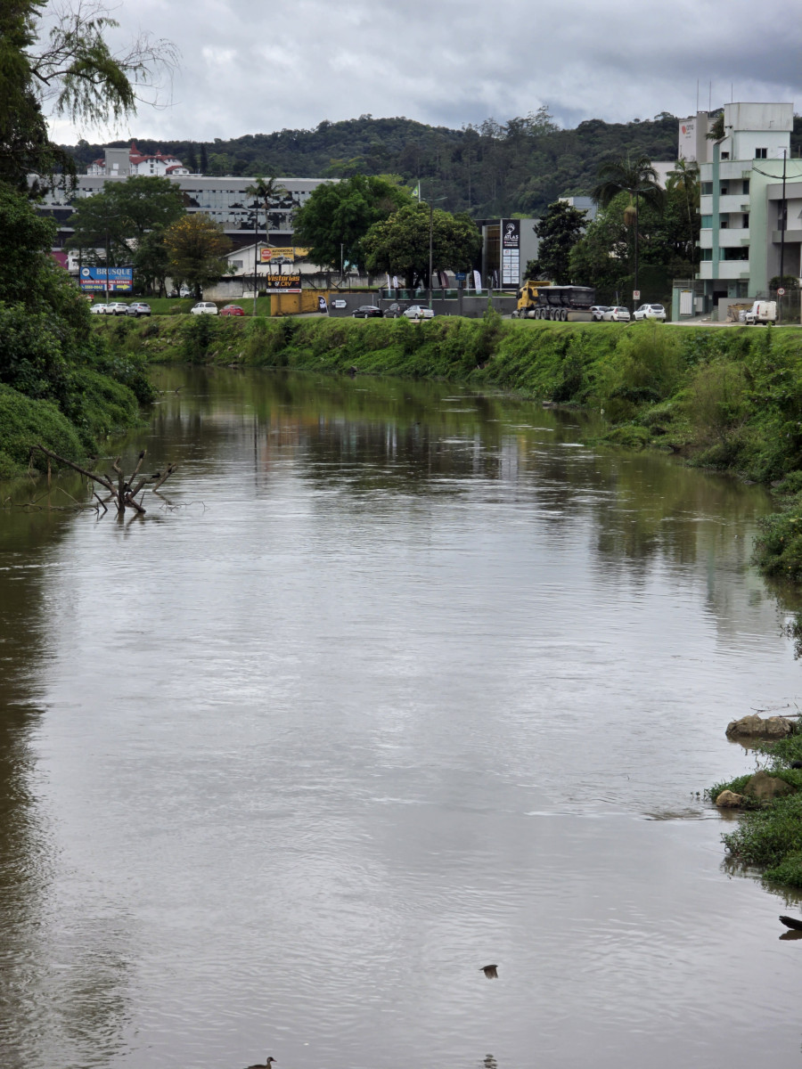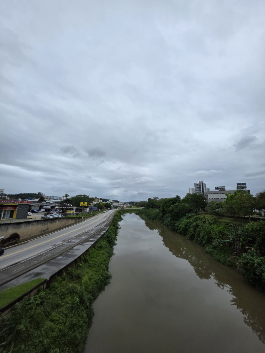 Nelas, pois, a cidade se revela sob tons de cinza, entre nuvens densas e flores coloridas, compondo mais um retrato singular de Brusque.