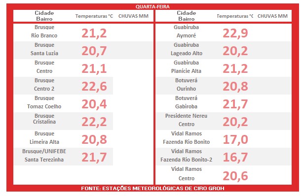 Os dados foram coletados a partir da rede de monitoramento meteorológico de Ciro Groh, composta por 17 estações distribuídas em Brusque e em diferentes pontos do Vale do Itajaí-Mirim.
