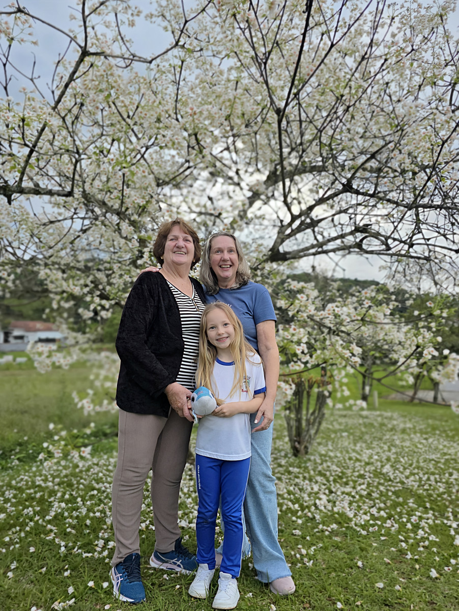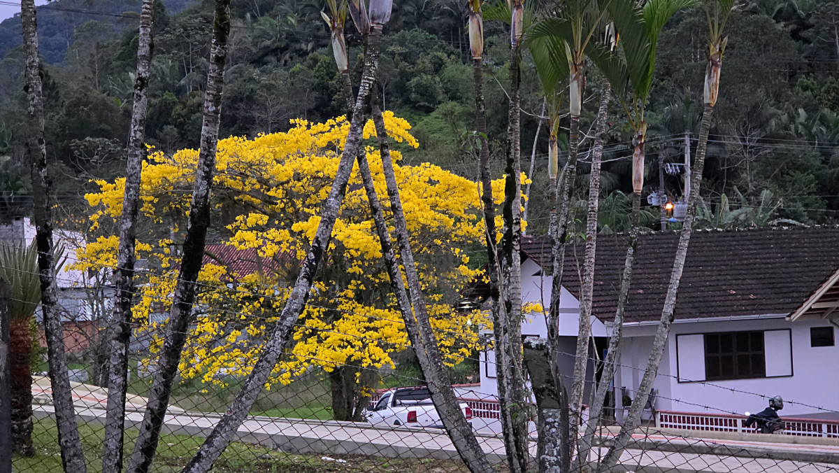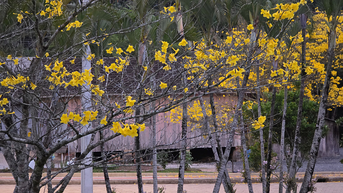 A protagonista desta narrativa é Zélia Schaefer Schlindwein, 76 anos, proprietária do terreno onde as árvores florescem com esplendor, emoldurando a área externa de sua residência.