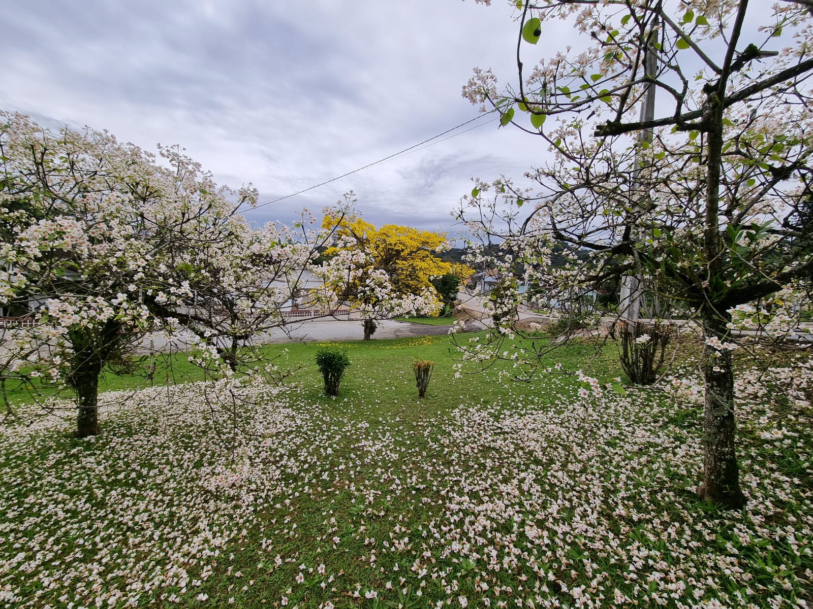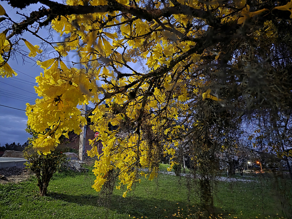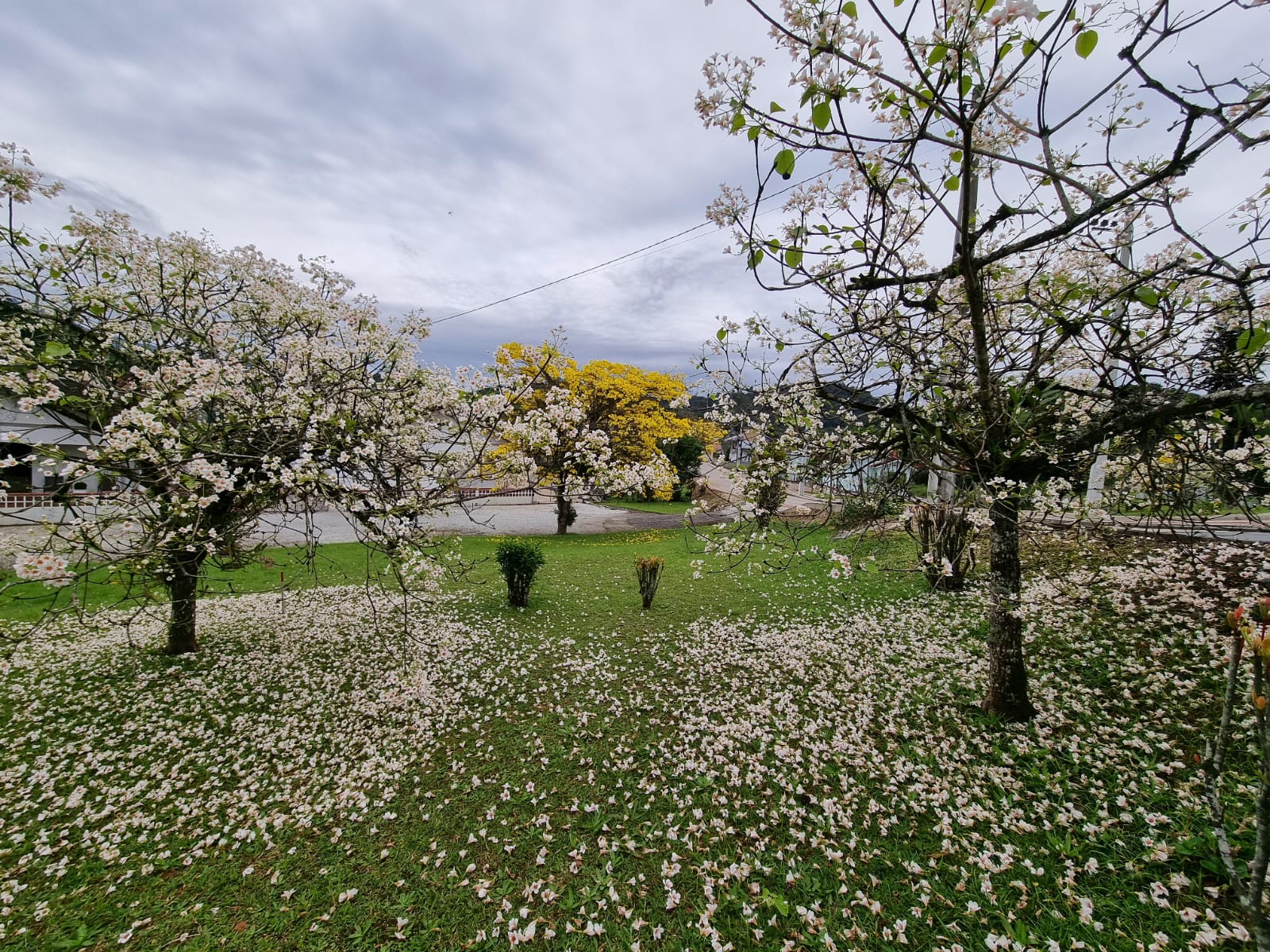 Comentários como “olha só que coisa mais linda” ecoam entre os transeuntes, enquanto o gramado se transforma em um verdadeiro tapete florido, contrastando com o verde das folhas e o amarelo vibrante dos ipês que também compõem o cenário.