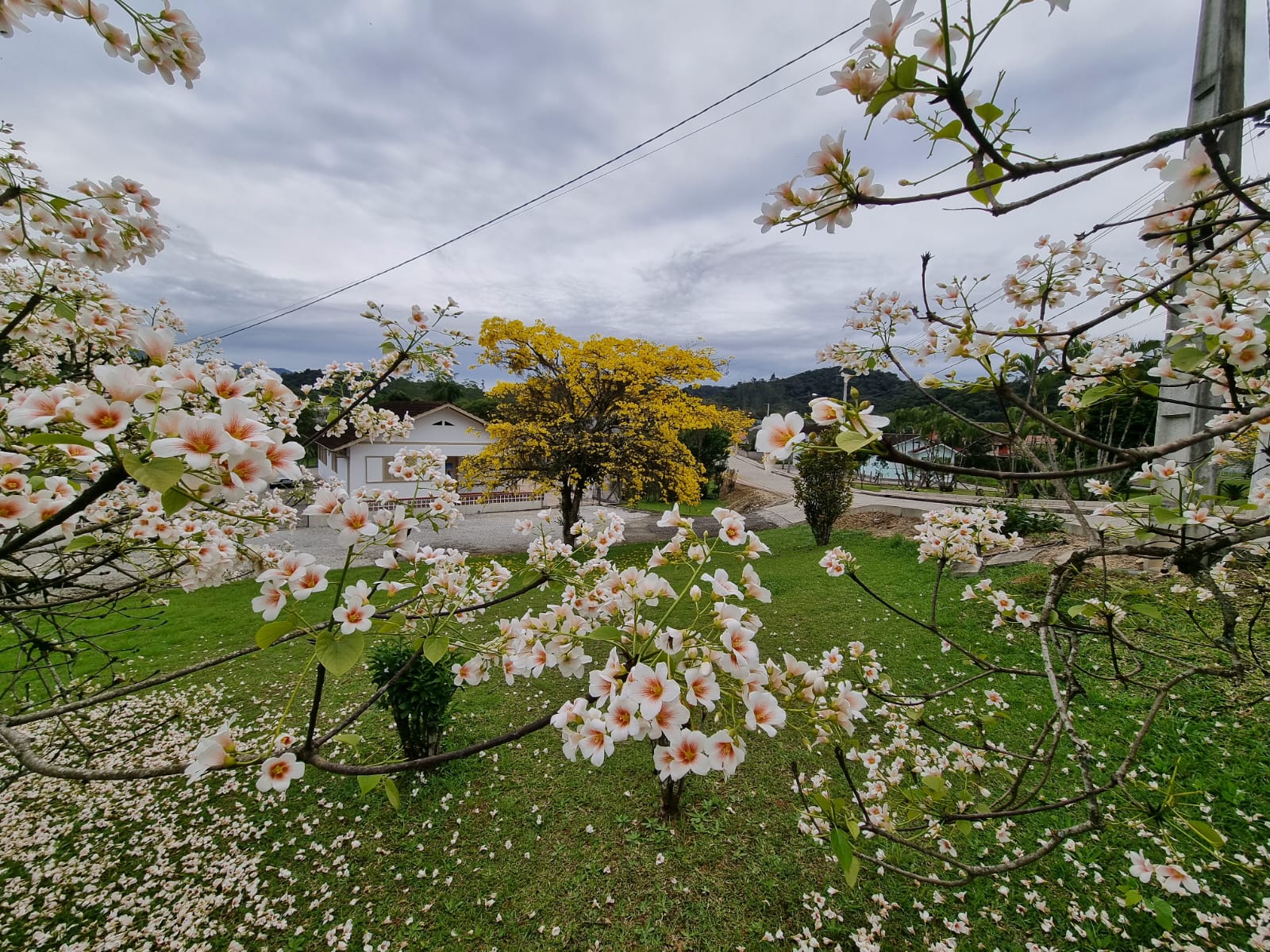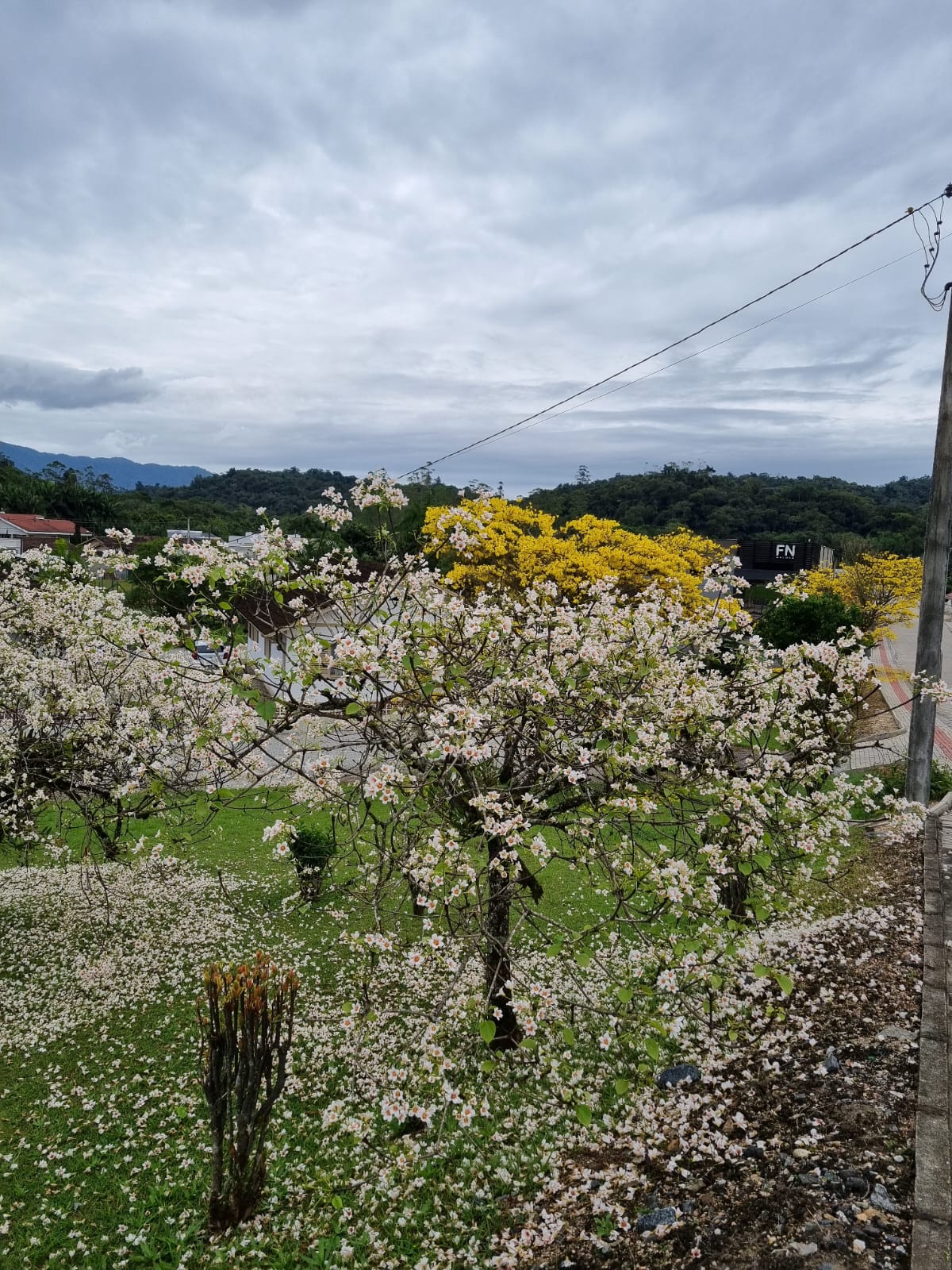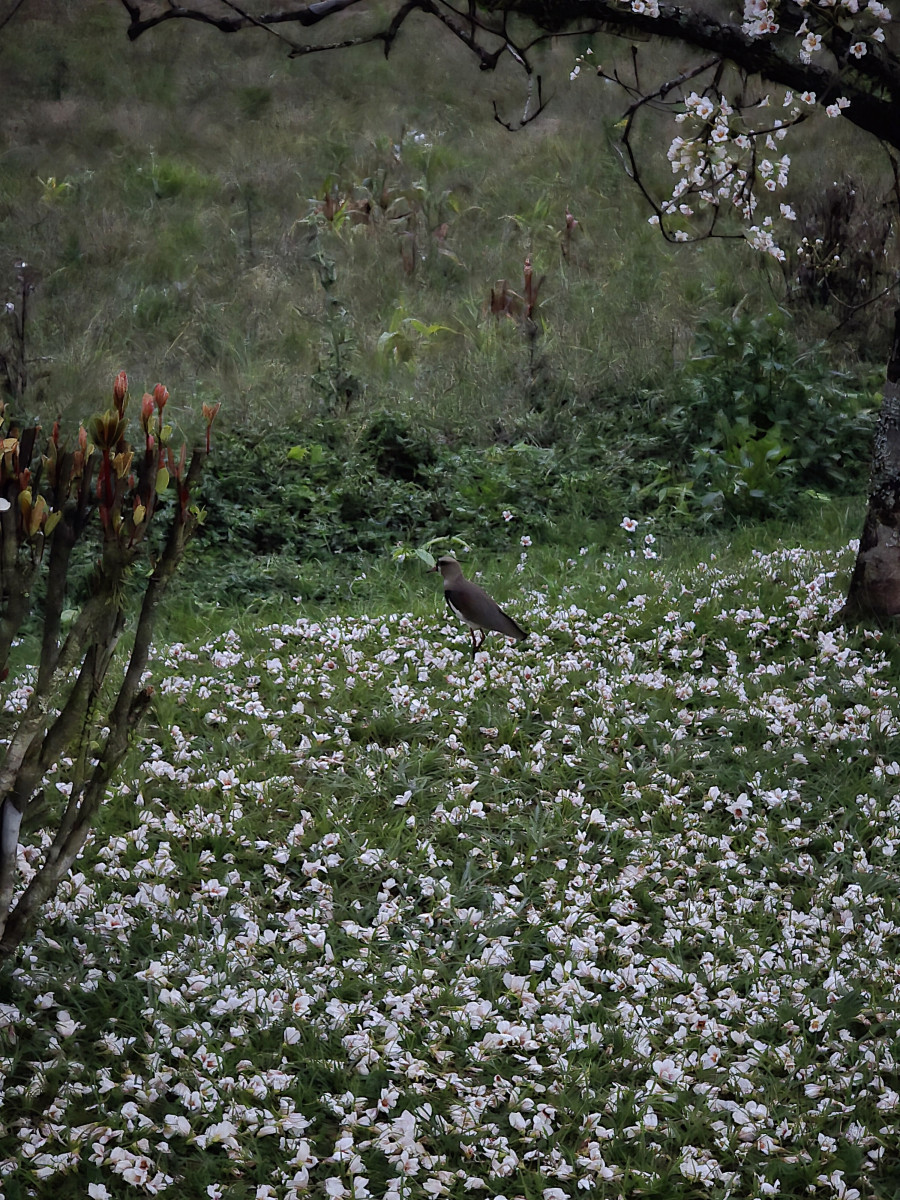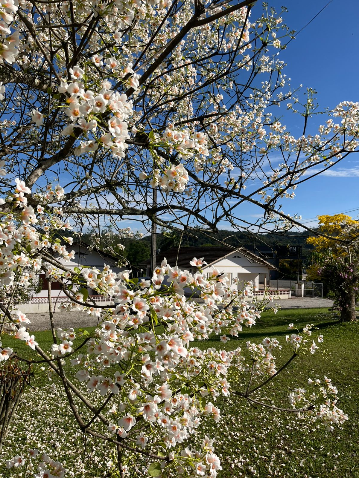 Comentários como “olha só que coisa mais linda” ecoam entre os transeuntes, enquanto o gramado se transforma em um verdadeiro tapete florido, contrastando com o verde das folhas e o amarelo vibrante dos ipês que também compõem o cenário.