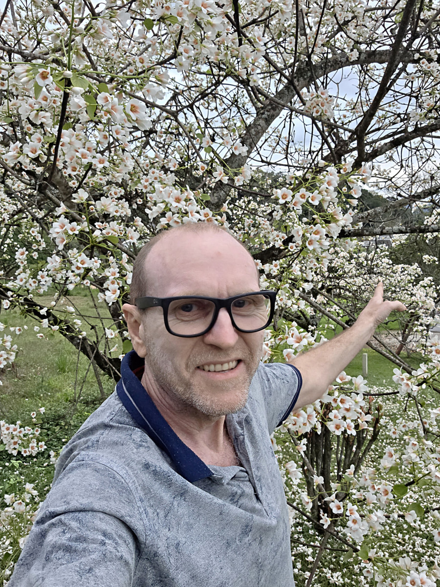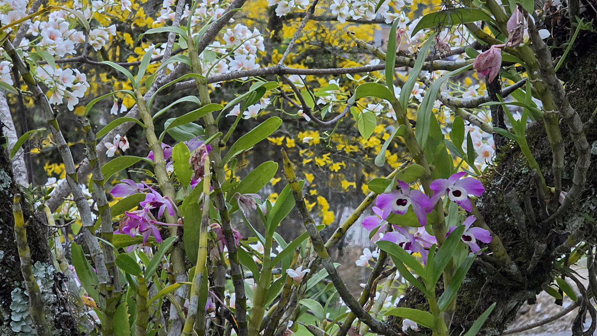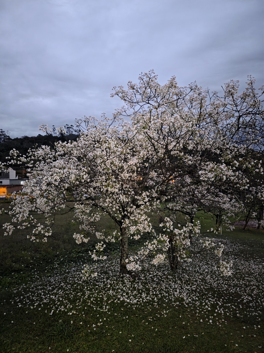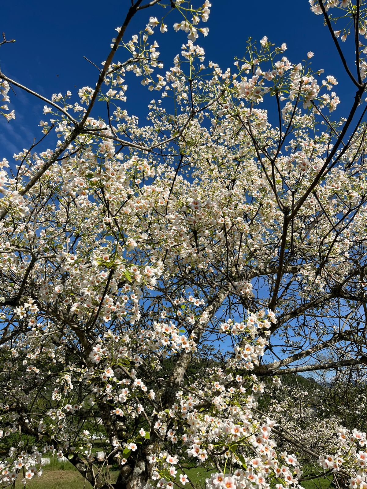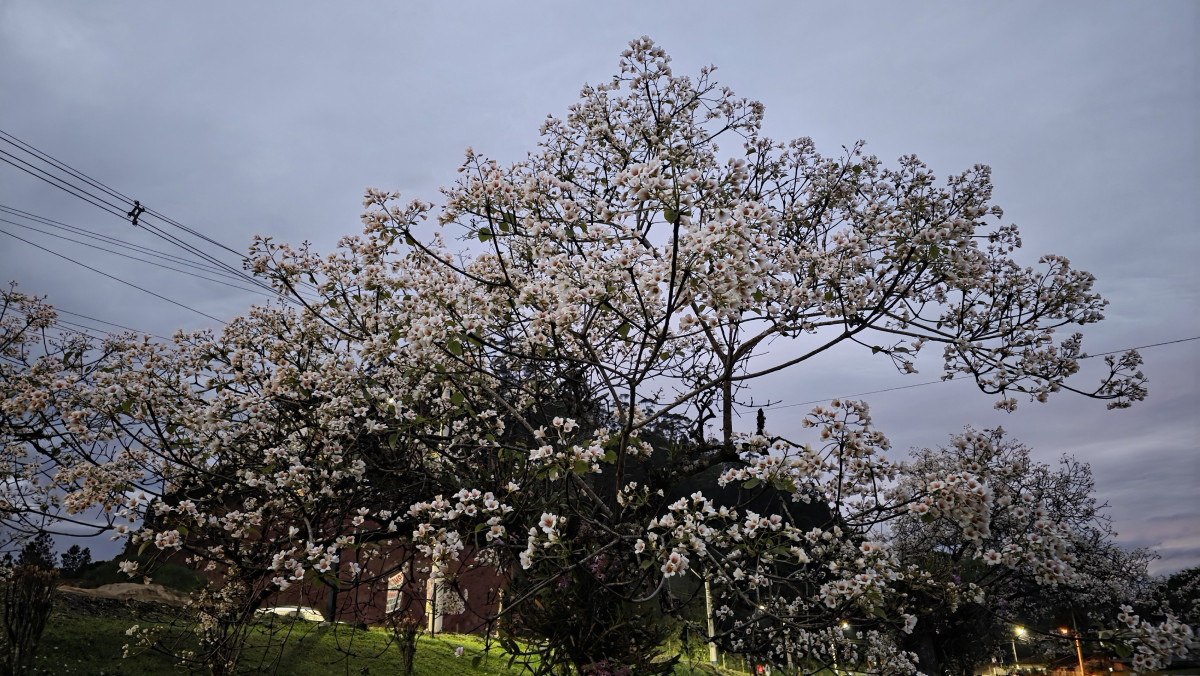 Trata-se do florescer exuberante das árvores de tungue — nome popular da espécie Vernicia fordii, originária da Ásia e reconhecida por suas flores delicadas em tons de branco e pêssego.