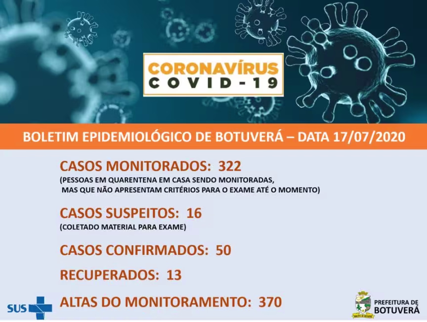 A Prefeitura de Botuverá informou que a cidade tem 50 casos confirmados de coronavírus. A informação foi divulgada nesta sexta-feira, 17. Destes, 37 são ativos e 13 são considerados recuperados.