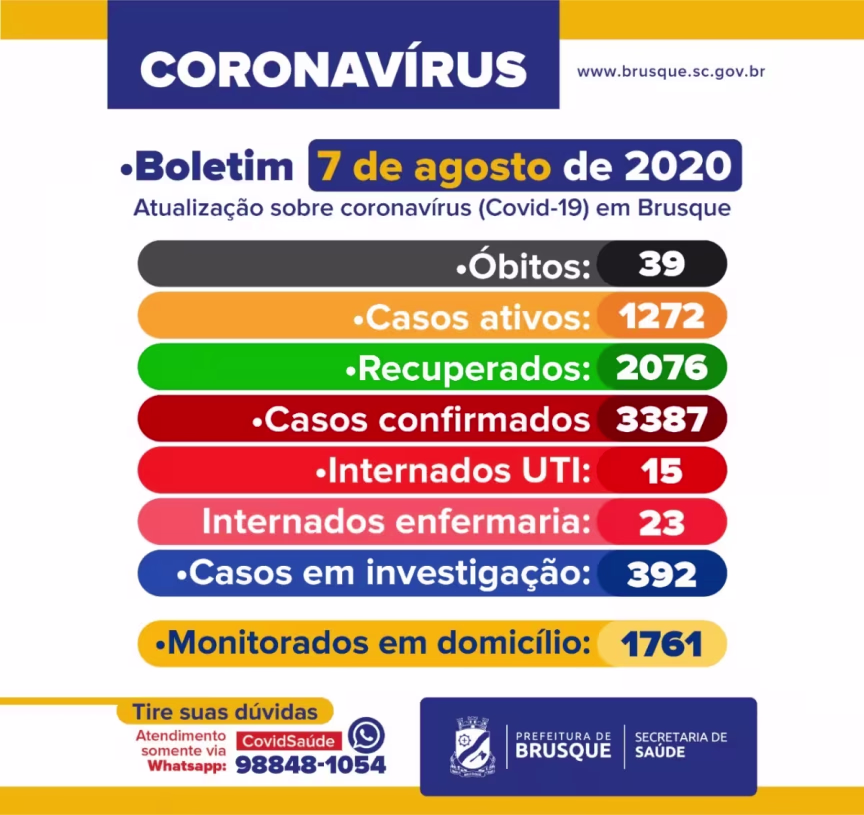 Ainda nesta sexta-feira, Brusque registrou o 39º óbito. A nova vítima é um homem, de 78 anos, morador do bairro São Luís. O paciente teve o início dos sintomas em 24 de julho. Ele não passou pelo Centro de Triagem e foi internado direto no Hospital Azambuja, no dia 26 do mesmo mês. No dia 28 foi transferido para a Unidade de Terapia Intensiva (UTI). Ele tinha histórico de comorbidades.