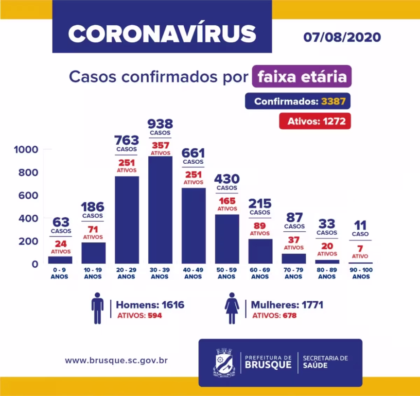 Em números absolutos, a maioria dos casos confirmados de coronavírus em Brusque é de mulheres. São 1.771 casos (678 ativos), contra 1.616 de homens (594 ativos). A faixa-etária de 30 a 39 anos é a que soma a maior quantidade de casos, tanto em número totais, quanto de ativos. São 938 e 357, respectivamente.