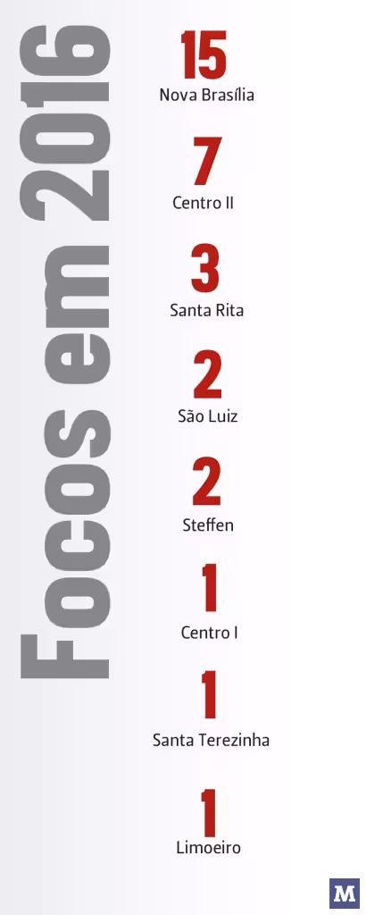 O Nova Brasília foi o bairro com mais focos – 15, seguindo do Centro II, 7 e do Santa Rita, 3.