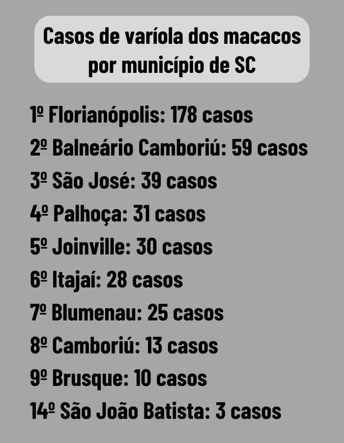 Um relatório do governo de Santa Catarina mostra que Brusque foi a nona cidade do estado que mais registrou casos de varíola dos macacos, mesmo com apenas dez casos confirmados. Os dados foram contabilizados até o dia 8 de agosto.