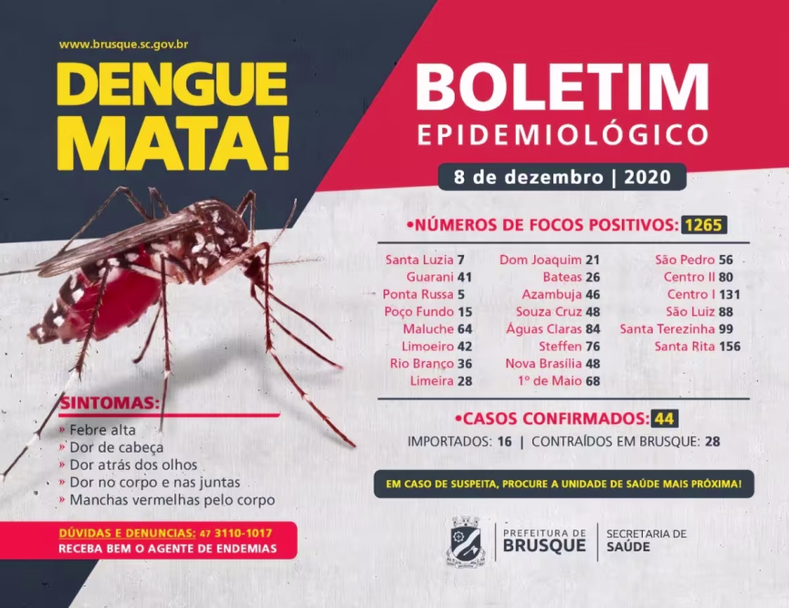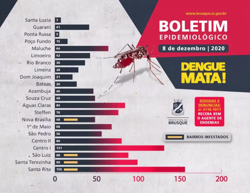 O bairro Santa Rita segue com maior número, 156; seguido pelo Centro, com 131, Santa Terezinha, 99 e São Luiz, 88. Quanto ao número de casos de dengue, são 44 confirmados, sendo 28 autóctones, ou seja, contraídos no próprio município de Brusque.