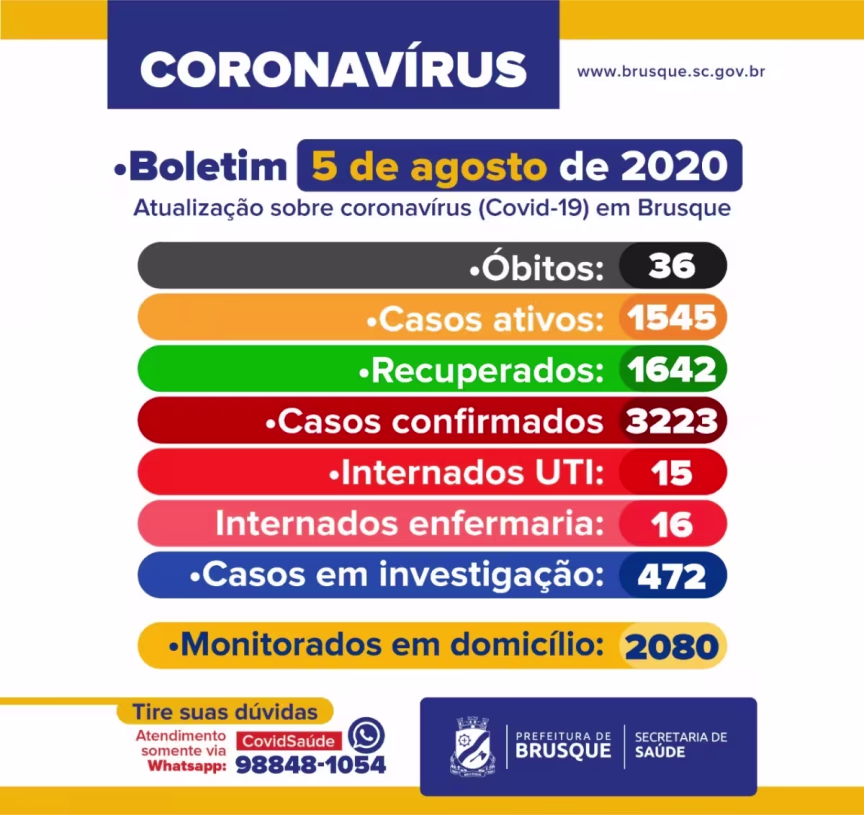 Brusque contabiliza nesta quarta-feira, 5, 3.223 casos confirmados de Covid-19. Agora, são 1.545 casos ativos e desde o início da pandemia no município foram registrados 36 óbitos.
