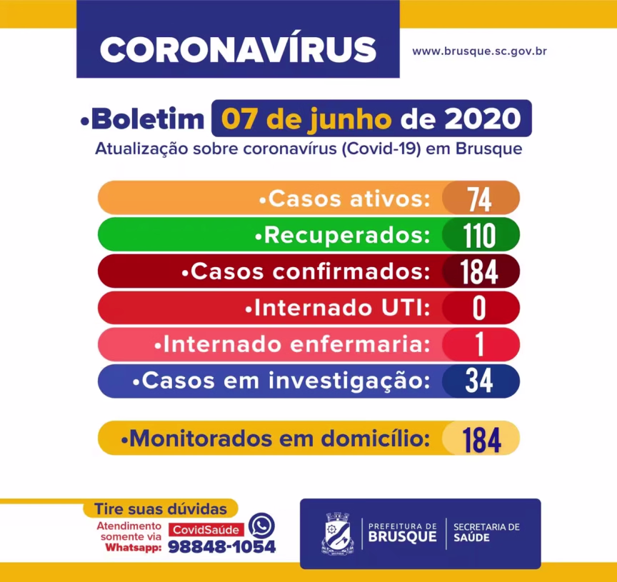 Neste domingo, 7, Brusque registrou mais cinco casos de Covid-19. No total, 184 moradores do município já receberam positivo para o novo coronavírus. Outros 34 ainda aguardam o resultado do exame.