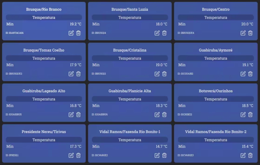 Confira na tabela abaixo, como ficaram as temperaturas mínimas. Os índices foram medidos na madrugada desta segunda-feira no Vale do Itajaí-Mirim: