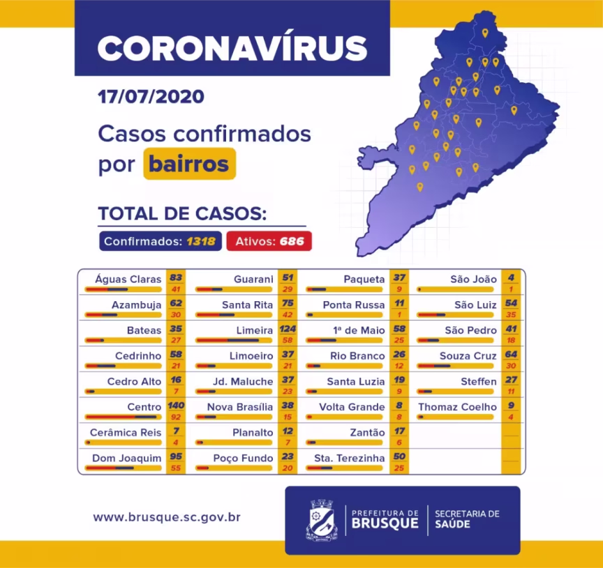 A maioria dos casos registrados em Brusque ainda está no Centro, com 140 casos. Destes, no momento 92 estão ativos. O bairro Limeira vem logo atrás com 124 casos no total e 58 ativos.