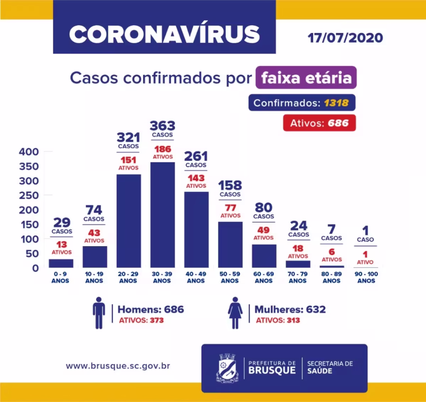 Brusque chegou nesta sexta-feira, 17, a 1318 casos confirmados de Covid-19. São agora 686 pessoas com os sintomas ativos e 632 recuperadas. O município registrou 10 óbitos até o momento. Ao todo, 25 pacientes estão internados, sendo 12 na enfermaria e 13 em UTI. São ainda 492 casos em investigação e 1223 monitorados em domicílio.