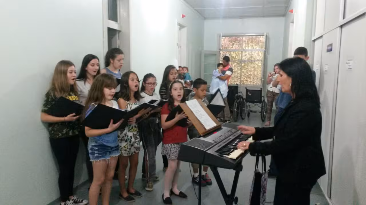 Regidos pela maestrina Ingrid Knihs Teske, o grupo, composto por 12 crianças e adolescentes, percorreu os corredores da ala pediátrica levando um repertório harmônico e alegre, trazendo, na visão da musicista, alegria, conforto e relaxamento a todos que estão internados.