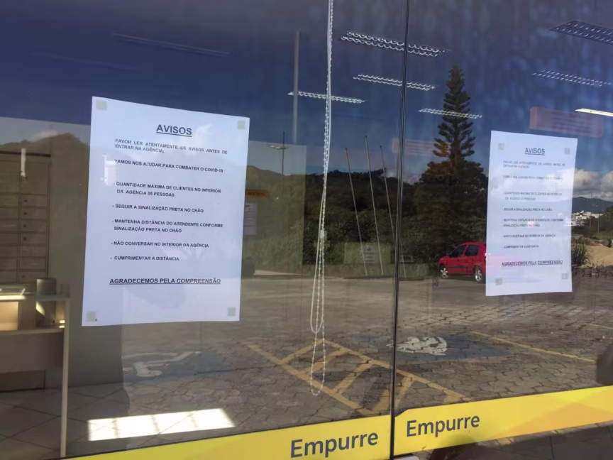 Ficou estabelecido que cinco é a quantidade máxima de clientes no interior da agência. Uma sinalização com fitas foi feita no chão para que a distância de segurança seja mantida entre os clientes e funcionários. Há também a recomendação de que as pessoas não conversem dentro do local e se cumprimentem à distância.