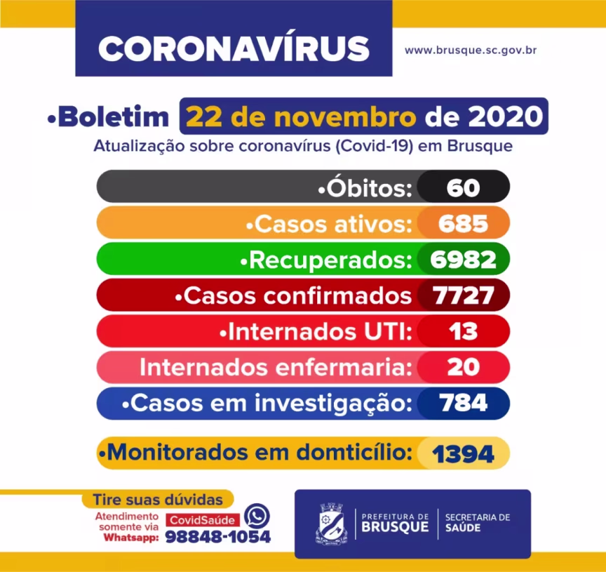 Ainda, 784 brusquenses aguardam o resultado do exame. Ao todo, 60 moradores da cidade já morreram em decorrência do vírus.
