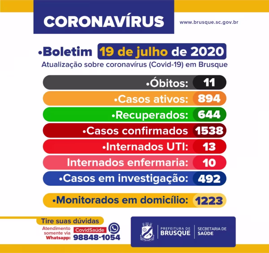 Outros 492 brusquenses aguardam liberação de resultados e 1223 seguem sendo monitoradas em residência. Na noite deste sábado, a cidade registrou sua 11ª vítima. Cirineu Locatelli, de 62 anos, morava no bairro Santa Rita.
