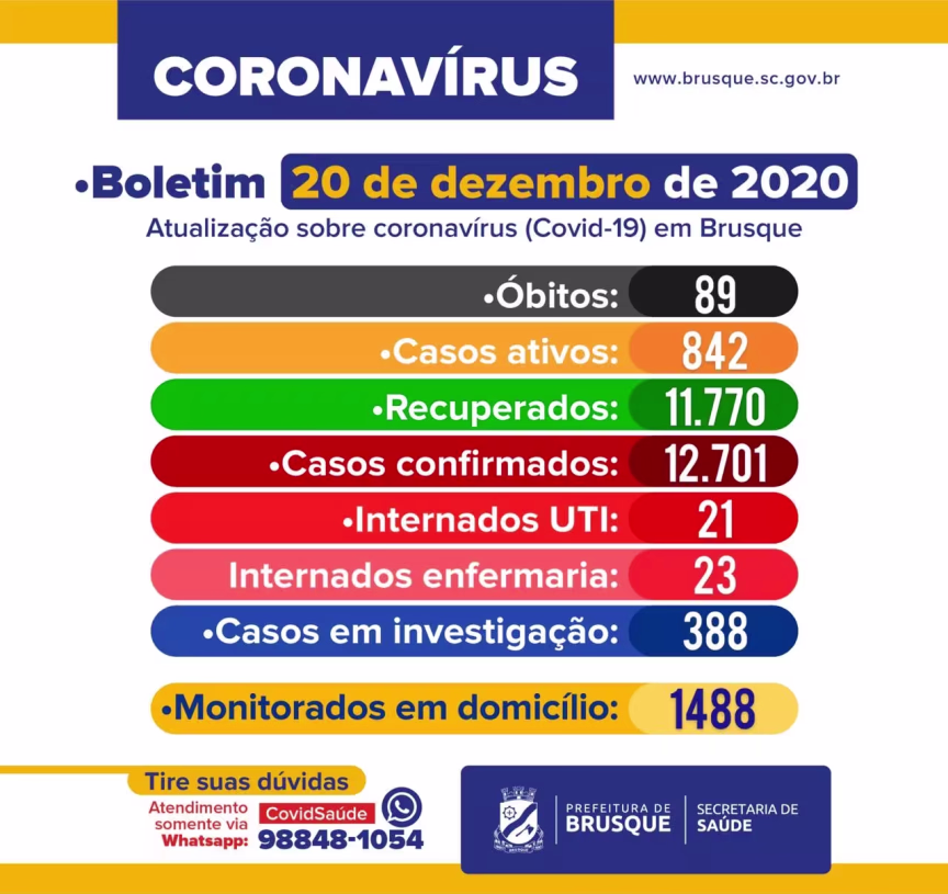 Neste domingo, 20, Brusque registrou 82 novos casos de Covid-19. Atualmente, 842 pacientes estão em tratamento. Destes, 44 estão internados, sendo 21 em UTI.