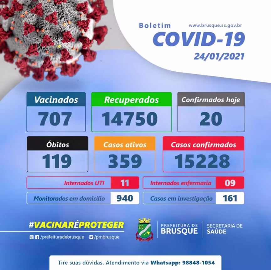 Desde o início da pandemia, 15.228 pessoas contraíram a doença, sendo que 14.750 são considerados recuperados e 359 casos estão ativos. Onze pacientes estão em Unidade de Terapia Intensiva (UTI) e nove internados em enfermaria. 161 exames aguardam a liberação de laudos e 940 moradores são monitorados em residência. Até hoje, 707 pessoas do grupo prioritário já receberam a vacina contra a Covid-19.