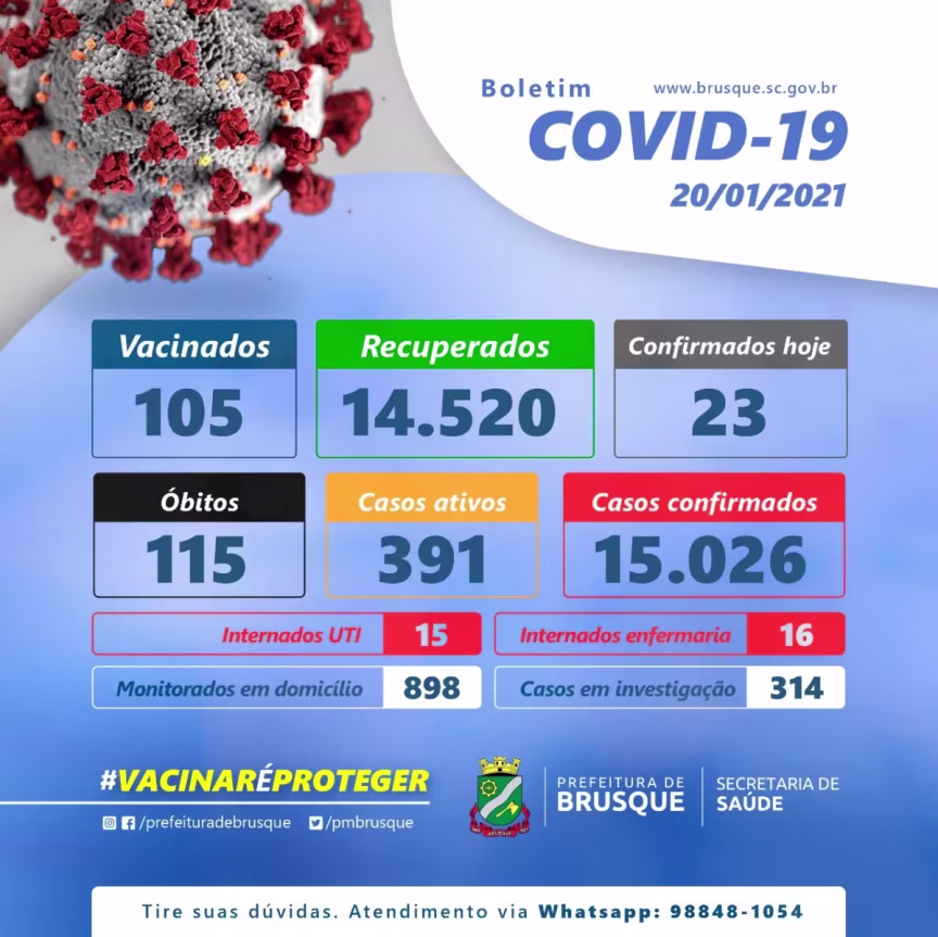 O novo boletim epidemiológico, divulgado nesta quarta-feira, 20, aponta que Brusque tem 15.026 casos confirmados de Covid-19. Nas últimas 24 horas foram registrados 23 novos casos da doença. Do total já registrado, 14.520 pessoas já estão recuperadas. Há 391 casos ativos.