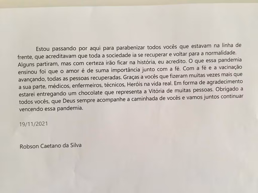 “Estou passando por aqui para parabenizar todos vocês que estavam na linha de frente , que acreditavam que toda a sociedade ia se recuperar e voltar a normalidade. Alguns partiram, mas com certeza irão ficar na história, eu acredito. O que essa pandemia ensinou foi que o amor é de suma importância, junto com a fé. Com fé e a vacinação avançando, todas as pessoas recuperadas, graças a vocês que fizeram muitas vezes mais que a sua parte, médicos, enfermeiros, técnicos, heróis da vida real. Em forma de agradecimento estarei entregando um chocolate que representa a vitória de muitas pessoas. Obrigada a todos vocês, que Deus sempre acompanhe a caminhada de vocês e vamos juntos continuar vencendo essa pandemia. 19/11/2021. Robson Caetano da Silva.”