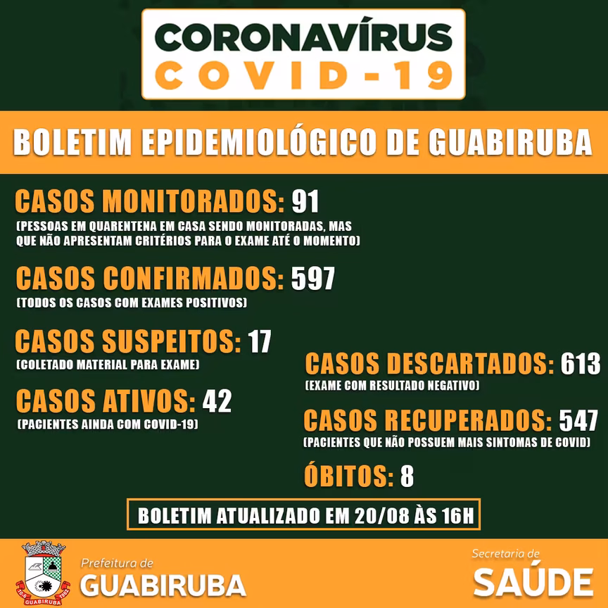 A Prefeitura de Guabiruba registrou mais onze casos positivos de Covid-19 nesta quinta-feira, 20. Agora a cidade tem 597 casos confirmados.