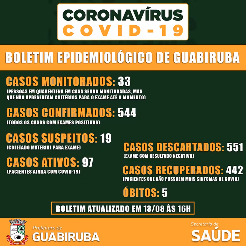 A Prefeitura de Guabiruba registrou nove casos positivos de Covid-19 nesta quinta-feira, 13. Agora a cidade tem 544 casos confirmados. Destes, 97 são casos ativos da doença e 442 são considerados recuperados.