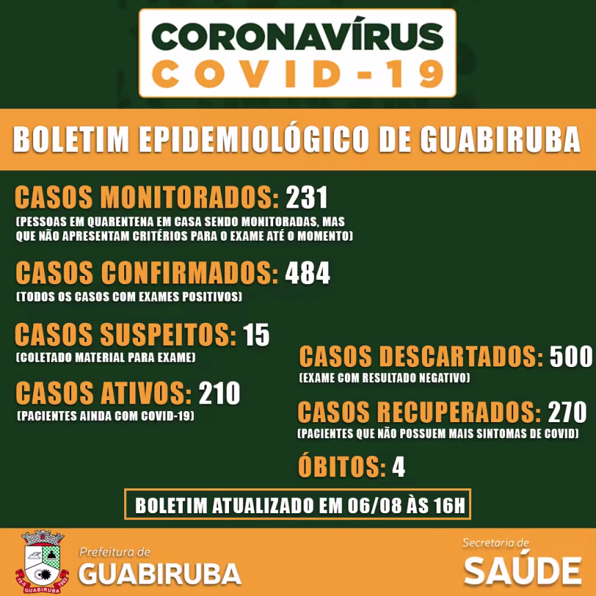 Ainda de acordo com boletim, Guabiruba tem 15 casos suspeitos de Covid-19. Até o momento, 500 casos já foram descartados após o resultado negativo. Outras 231 pessoas estão sendo monitoradas em suas residências pela equipe de saúde.