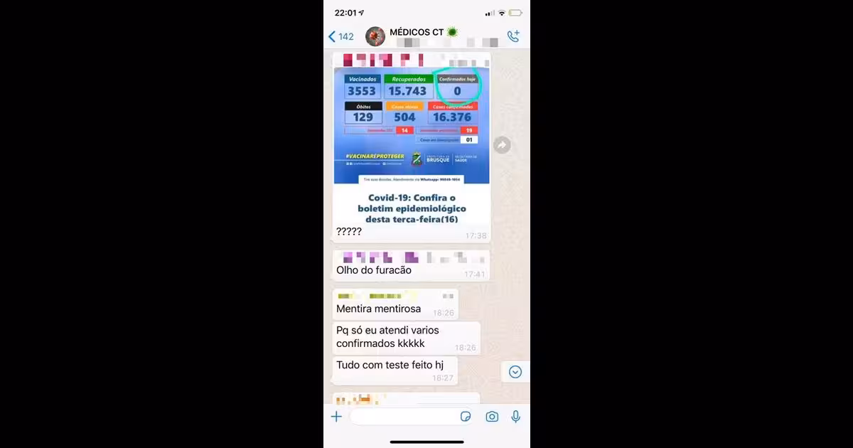 Em grupo no aplicativo de mensagens WhatsApp intitulado "MÉDICOS CT", a informação foi recebida com surpresa. "Mentirosa mentirosa", diz um dos membros. "Só eu atendi vários confirmados", continua. "Tudo com teste feito hj (sic)", finaliza.