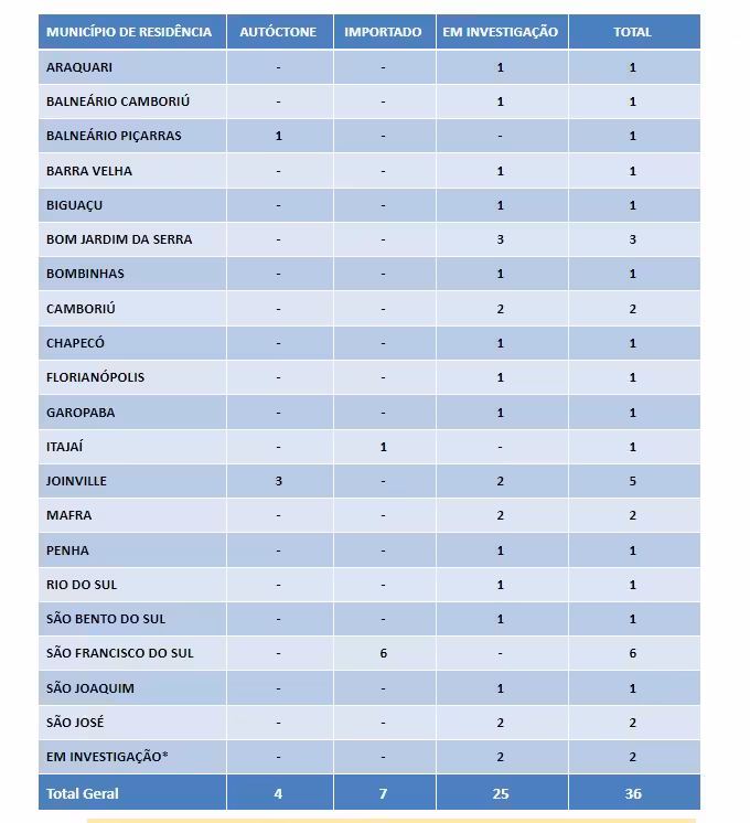 O Centro de Informações Estratégicas (CIEVS-SC), da Diretoria de Vigilância Epidemiológica (Dive-SC), acompanha o trabalho das equipes de vigilância em saúde dos municípios na investigação epidemiológica dos casos quanto ao local provável de infecção. O Centro identifica se os mesmos possuem histórico de viagem para fora do estado nos últimos dias, bem como buscar o monitoramento e rastreamento de contatos próximos.