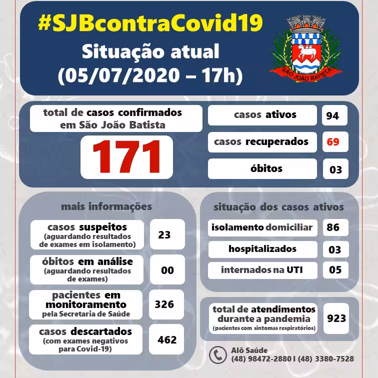 Além disso, outros sete casos foram descartados neste domingo. Há ainda 23 casos suspeitos, 326 pacientes em monitoramento. São João Batista conta com 94 casos ativos de coronavírus, 69 casos recuperados e três óbitos.