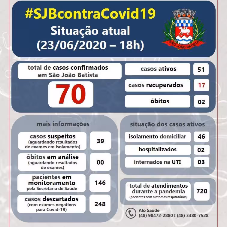 Mais 24 casos de Covid-19 foram confirmados nesta terça-feira, 23, em São João Batista. O número registra um recorde de novos casos registrados no mesmo dia. Com isso, a cidade chega a marca de 70 casos da doença. Deste total, 13 têm vínculos com registros anteriores e foram identificados pela triagem conduzida pela Vigilância Epidemiológica.
