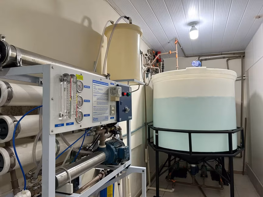 Para garantir a qualidade dessa solução, a Renal Vida realiza a filtragem da água. Antes de entrar na máquina de diálise, a água proveniente do Samae passa por três filtros, além do filtro de osmose, que remove todas as moléculas de metal, alumínio e cloro da água.