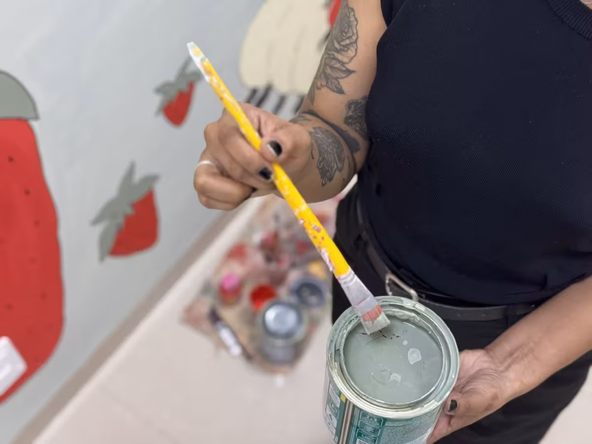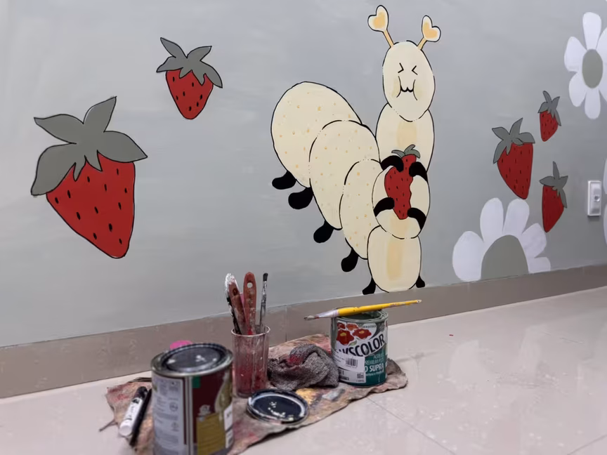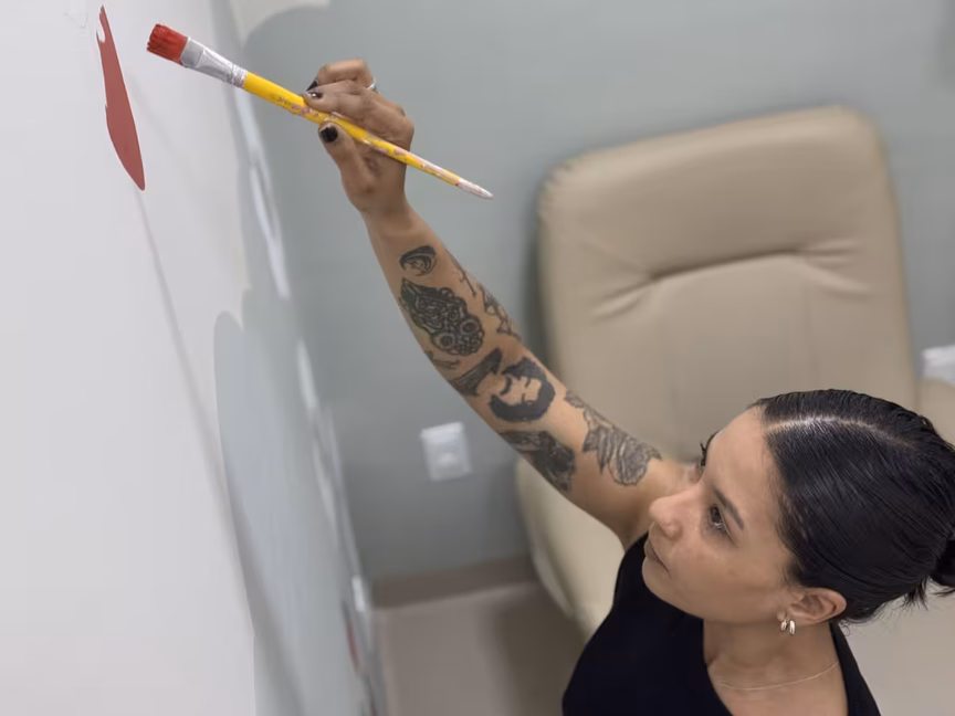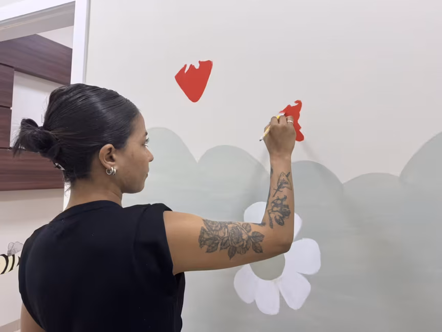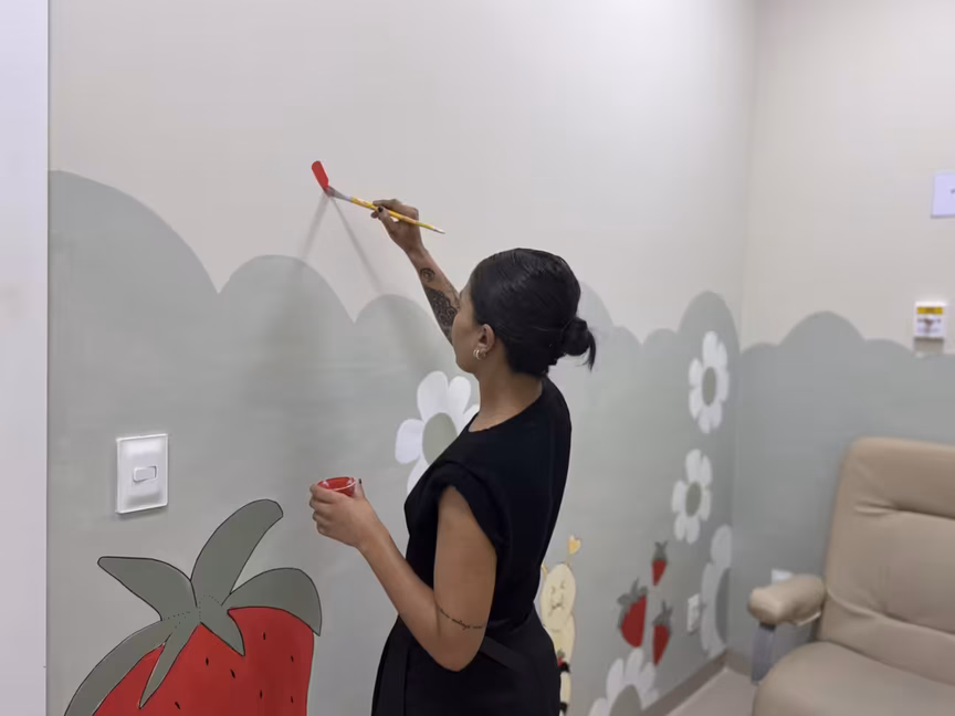 Amanda está pintando as paredes da recepção e das salas de quimioterapia infantil e adulta, e também deve colorir as salas de internação da oncologia, tanto adulta quanto pediátrica. No futuro, ela também deve levar cores para os corredores do hospital.