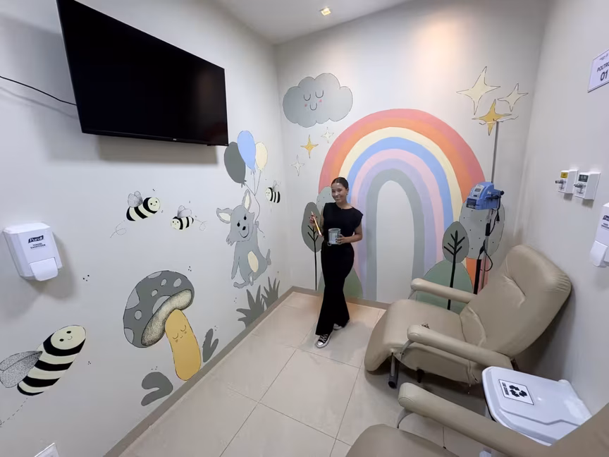 Neste sentido, a enfermeira explica que os desenhos foram pensados de forma aleatória, mas reforça o propósito de transmitir conforto, utilizando cores suaves. “Não faz diferença apenas para os pacientes, mas também para os profissionais de saúde. Entrar aqui e não ver só paredes brancas, como é comum em ambientes hospitalares, traz uma melhora no humor e no bem-estar, que é surreal”, destaca.