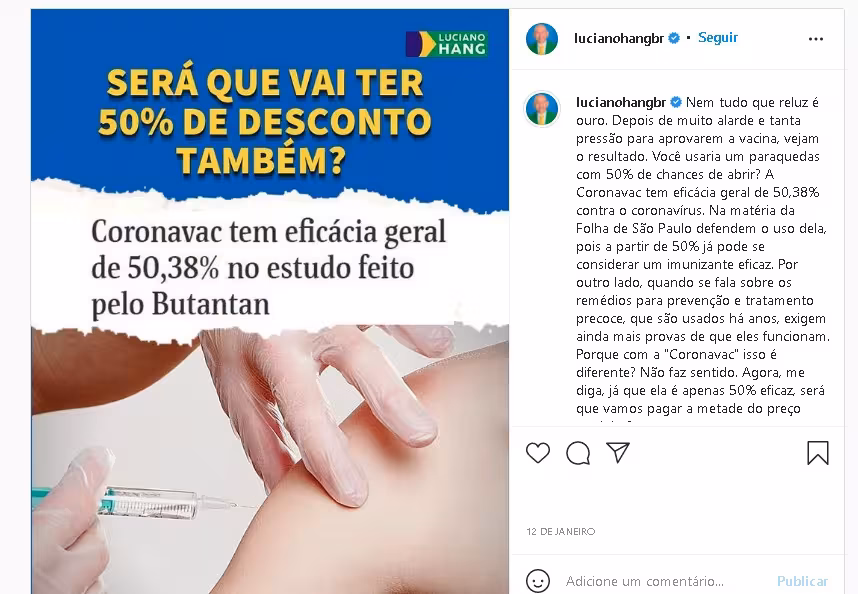 No relatório, são apontadas diversas publicações de Luciano nas redes sociais que são relacionadas à pandemia. Confira abaixo: